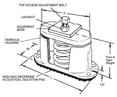 C Housed Spring Isolator Mounts may be used on outdoor applications. These vibration isolation spring mounts have lateral stability and are recommended for moderate horizontal wind loads without seismic restraint requirements.